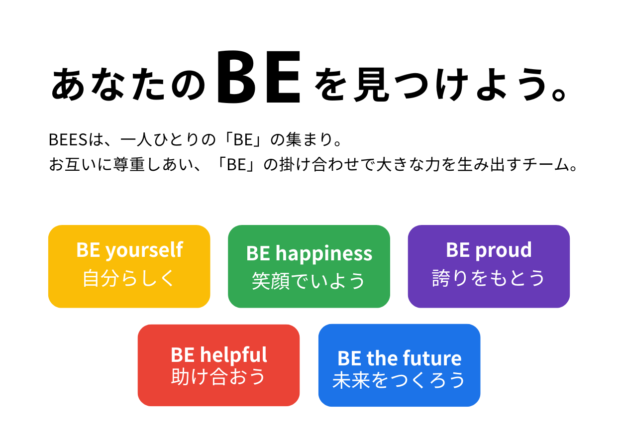 BEESは、あなたの可能性を最大限に引き出す場所です。一人ひとりの「こうなりたい」、「こう在りたい」という想いを尊重し、苦手なことは助け合い、チームでお客様の事業に貢献します。